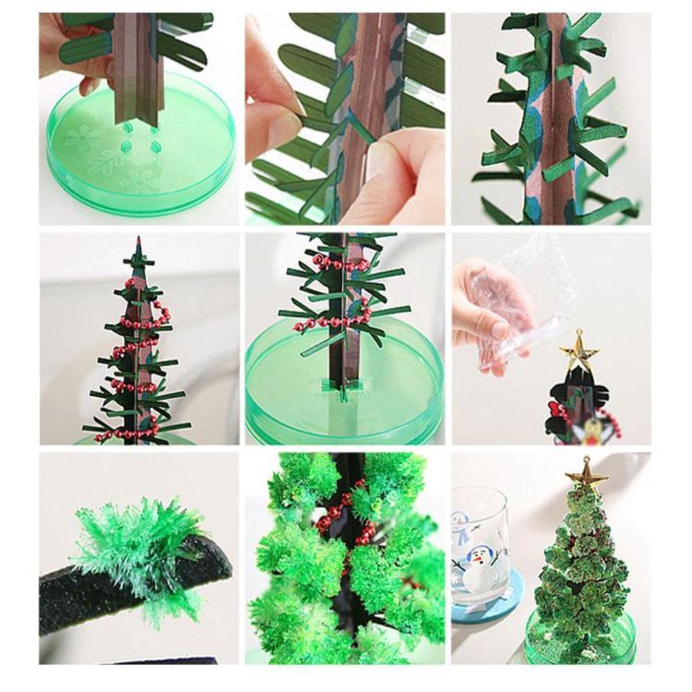 - Easy to use: Simply add the special magic liquid to the base of the cardboard tree and watch the crystals grow. You will see the tree sprouts green foliage on its branches.